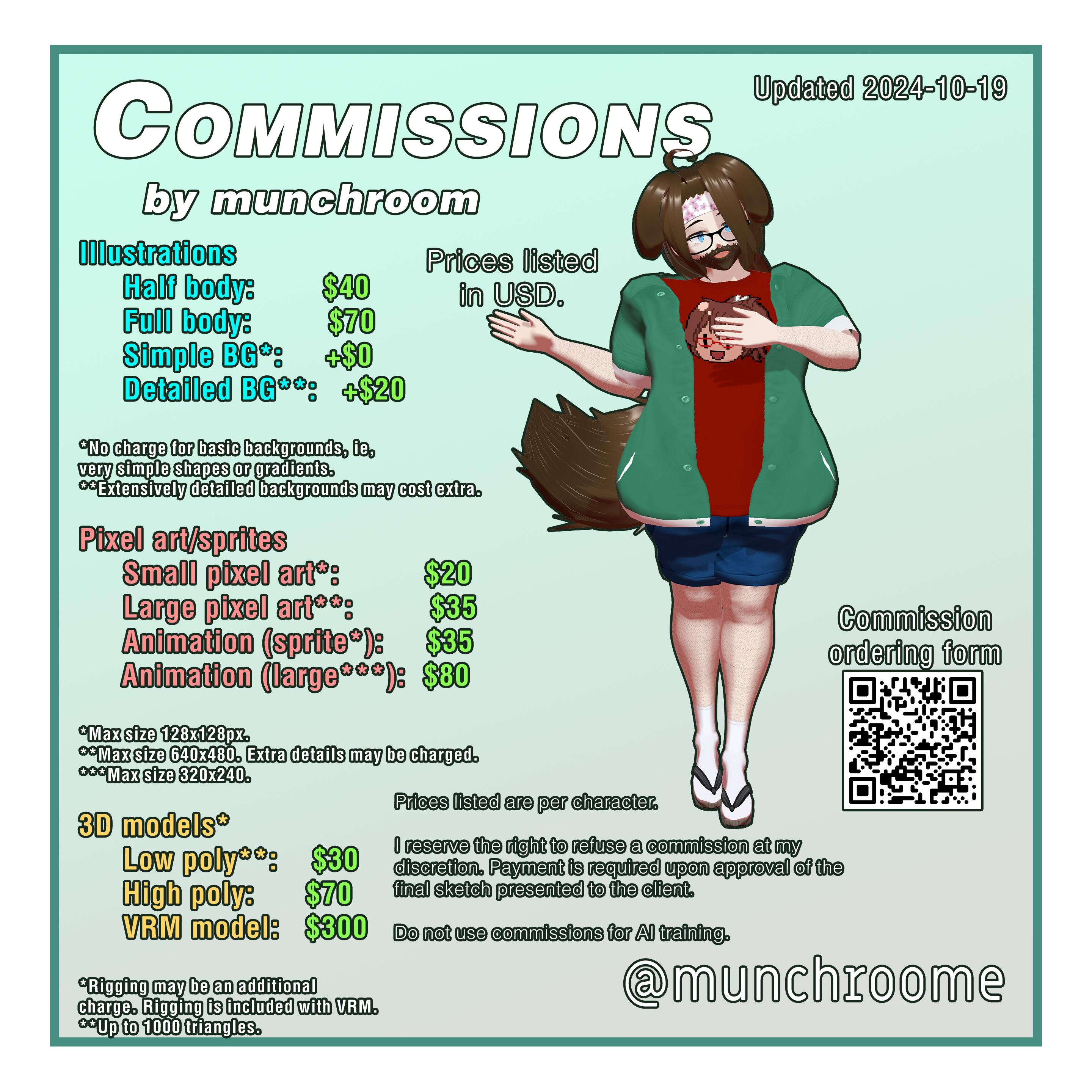 Illustrations will include a render of your commission in .png format, as well as a recorded timelapse and the raw .clip file. Pixel art will include a .png/.gif and the raw Aseprite .ase file, and 3D models will include the raw .blend file, as well as an .fbx file or .vrm, depending on the type of model. Due to technical limitations, pixel art and 3D commissions will NOT include timelapses.